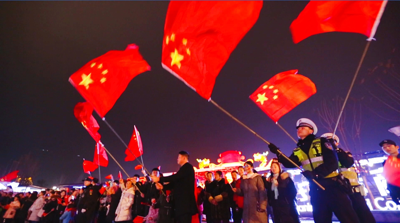 1月31日晚20:00,熊貓燈會華燈璀璨,人流熙熙攘攘?!拔逍羌t旗迎風飄揚,勝利歌聲多么嘹亮……”清脆的童聲突然響徹夜空,讓所有人停下了腳步。音樂漸漸響起,人群中響起了唱合的聲音。越來越多的人走了出來,他們身上佩戴著紅色的圍巾,臉上畫著五星紅旗,手中拿著五星紅旗,一邊歌唱,一邊走向燈會的中心廣場。一百多名快閃表演者在中心廣場最具中國傳統(tǒng)特色的“盛世宮燈”前匯聚成矩陣,二十多只大熊貓胖墩兒也手持五星紅旗加入其中?!拔覑勰阒袊?,心愛的母親,我為你流淚,也為你自豪……”載歌載舞的快閃表演,很快把園內(nèi)的觀燈群眾吸引了過來,隨著歌曲的高潮,全場五星紅旗都揮舞起來,人們高舉雙手,打著拍子,一起唱和,激情澎湃。
