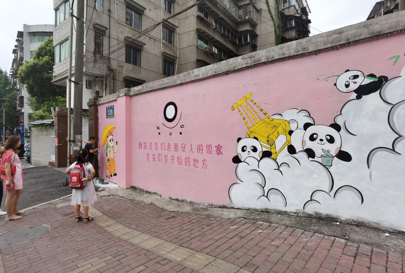 二是公開征集樣板作品。以“為愛而繪·涂鴉先鋒”為主題,為征集來的墻面免費彩繪。老西城縣前街一墻面陳舊,墻繪師將大熊貓和哆啦A夢結(jié)合,圖文并茂、通俗易懂,表達“熊貓老家在雨城”。土橋社區(qū)雅安城市音樂廳外墻面破損,墻繪師大膽選用粉紅色調(diào),“雅雅安安的音樂會”與周邊環(huán)境反差萌,吸引無數(shù)市民打卡拍照。