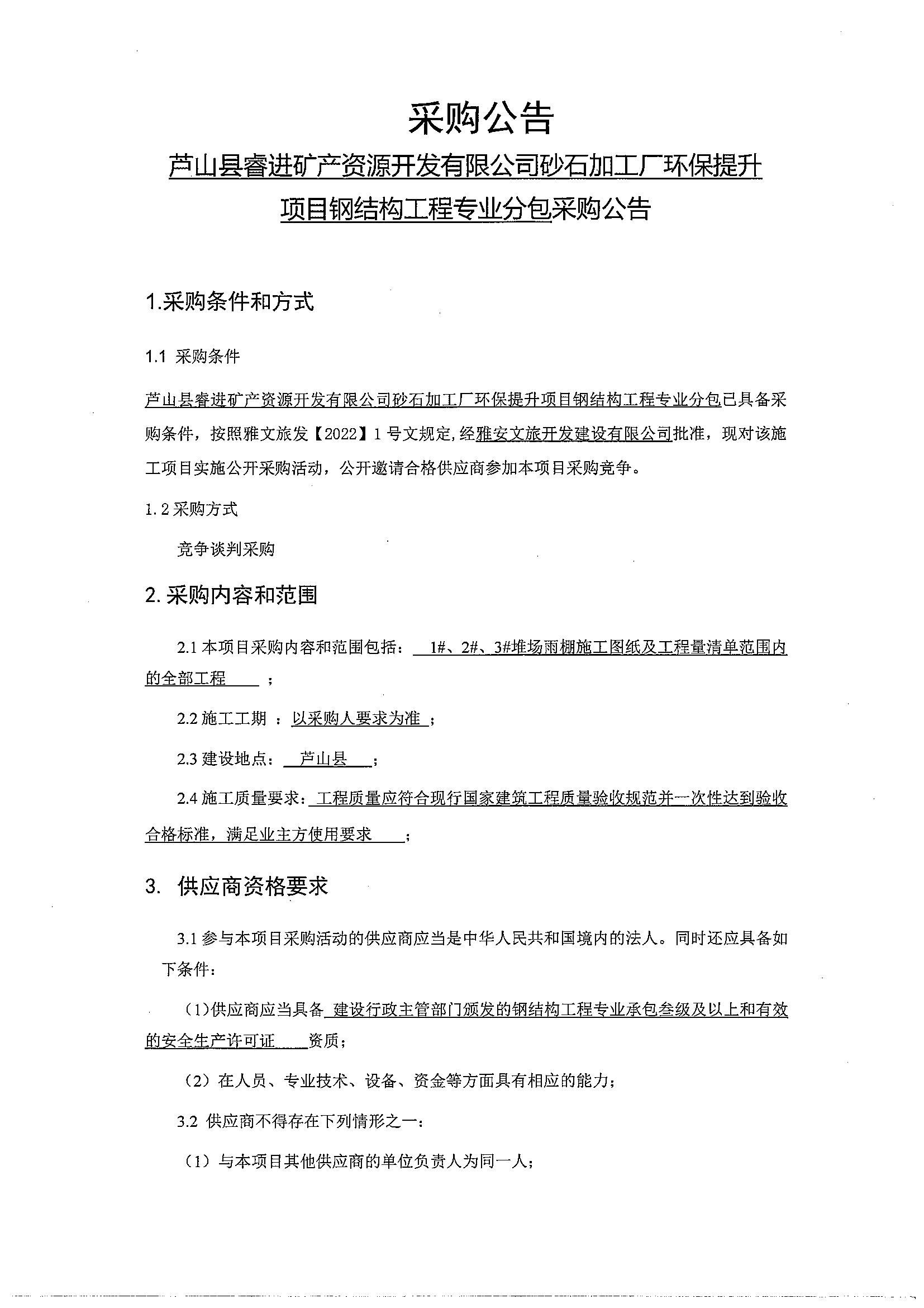 蘆山縣睿進(jìn)礦產(chǎn)資源開(kāi)發(fā)有限公司砂石加工廠環(huán)保提升 項(xiàng)目鋼結(jié)構(gòu)工程專業(yè)分包采購(gòu)公告