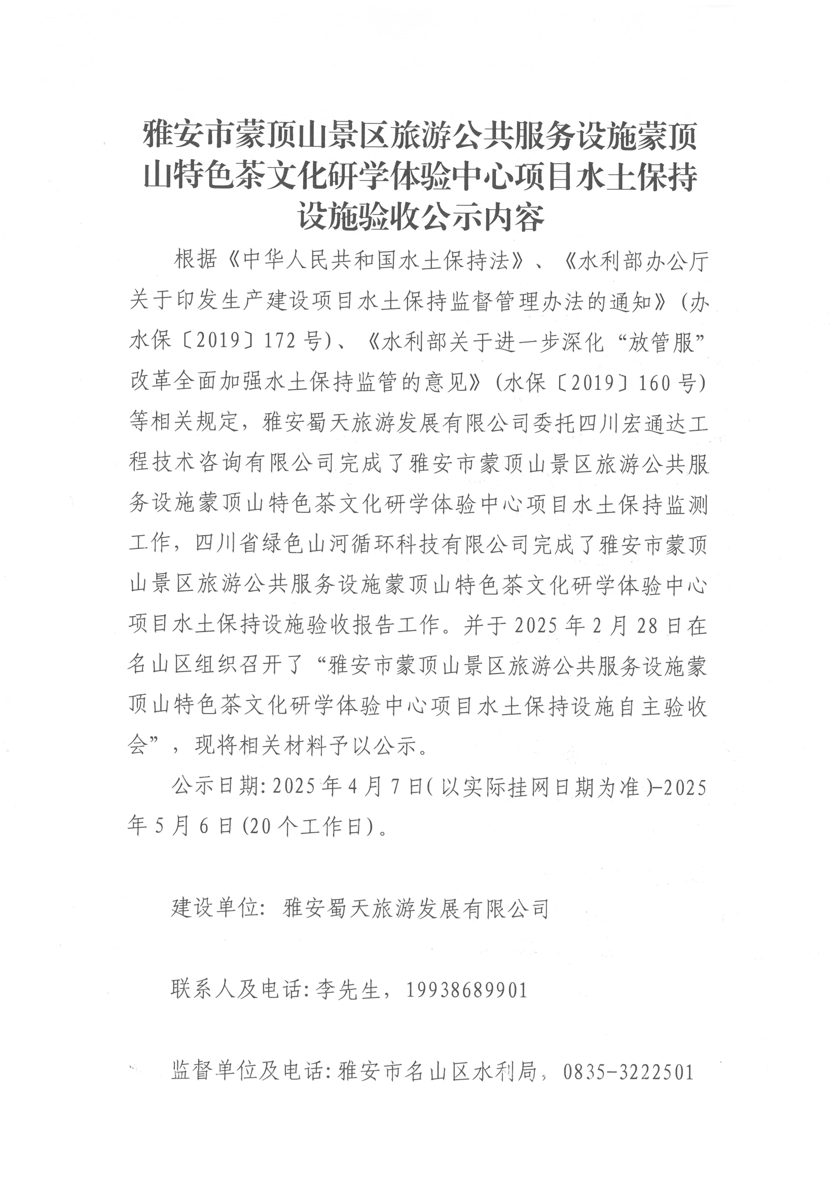 雅安市蒙頂山景區(qū)旅游公共服務(wù)設(shè)施蒙頂山特色茶文化研學(xué)體驗中心項目水土保持設(shè)施驗收公示內(nèi)容