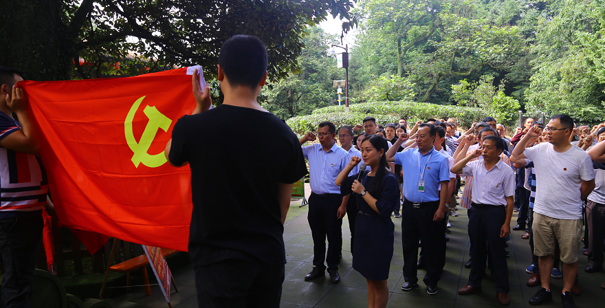 活動中,城鄉(xiāng)黨員步行攀登蒙頂山,尋訪古茶樹、探訪甘露井、瀏覽皇茶園、拜謁茶神,了解家鄉(xiāng)、認(rèn)識雅安。在紅軍百丈關(guān)戰(zhàn)役紀(jì)念館外,由文旅公司支部書記殷麗華帶領(lǐng)90多名黨員重溫入黨誓詞,黨員干部鏗鏘的語調(diào),誠摯的心聲,既是莊嚴(yán)的承諾,也是每一名黨員的奮斗目標(biāo)。